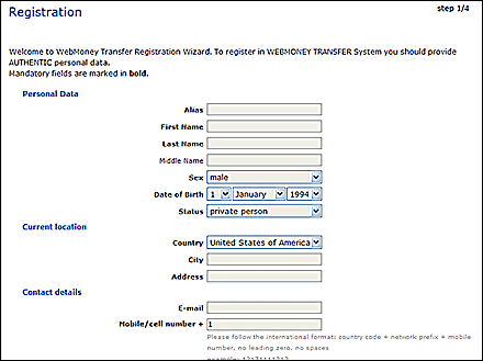 There are 4 stages to opening your WebMoney account and the first is by entering and confirming your personal information.